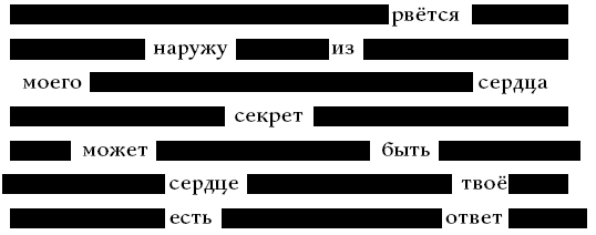 Я дважды проверила, что письмо предназначалось мне, и вскрыла конверт. На первый взгляд могло показаться, что внутри пусто. Я перевернула конверт и потрясла его. К моему разочарованию (и некоторому недоумению), оттуда вылетел кусок бумаги. Им оказалась вырванная из книги страница, бóльшая часть слов на которой была закрашена чёрным маркером. Но остались и незакрашенные, складывающиеся в блэкаут-стихотворение[4]:
