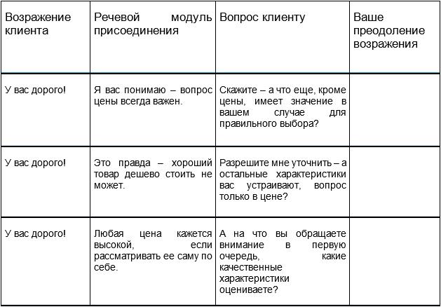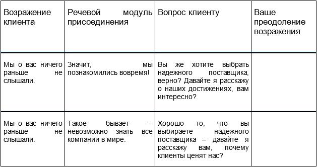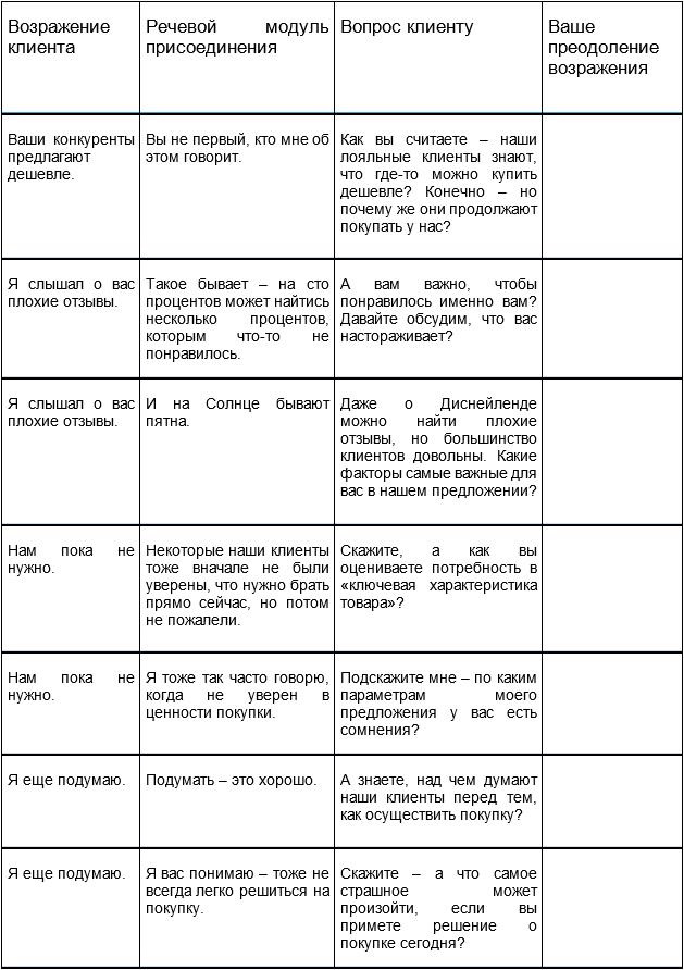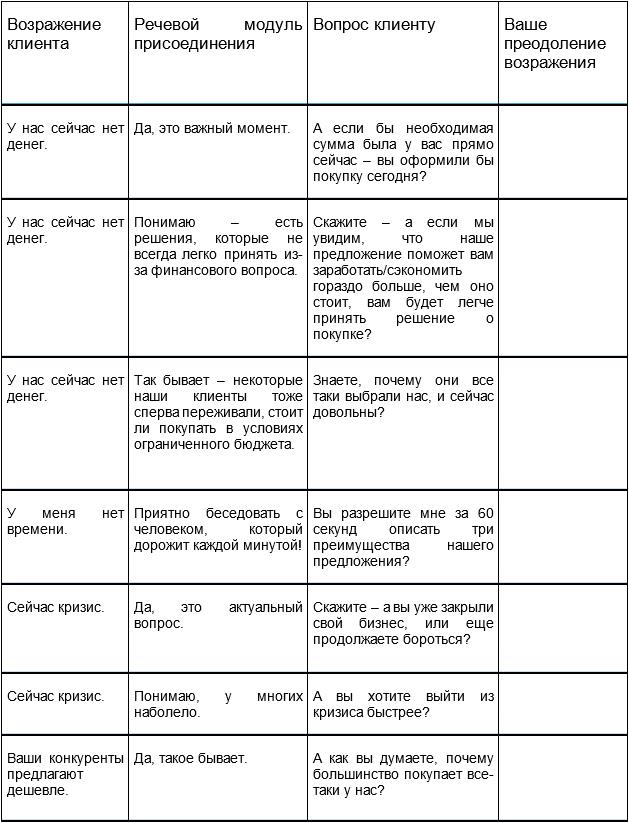 Безусловно, в вашем случае специфических возражений может быть гораздо больше – мы привели в таблице лишь примеры с наиболее часто встречающимися. Рекомендуем вам использовать подобную таблицу в вашем отделе продаж, сделав её доступной для всех менеджеров по продажам, и отрабатывая преодоление таких возражений буквально каждый день. Это можно делать на утренних операционных собраниях отдела, во время обеденных перерывов, в специально выбранных в течение дня десятиминутках повышения профессионализма. Когда продавцы смогут использовать речевые модули по преодолению часто встречающихся возражений в автоматическом режиме – эффективность их продаж существенно повысится!
