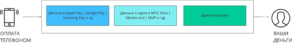 1. Когда вы платите телефоном, то транзакция идет сначала в Apple Pay | Google Pay и тд, и проверяет вас там, находит ваши данные и отправляет транзакцию уже в платежную систему.