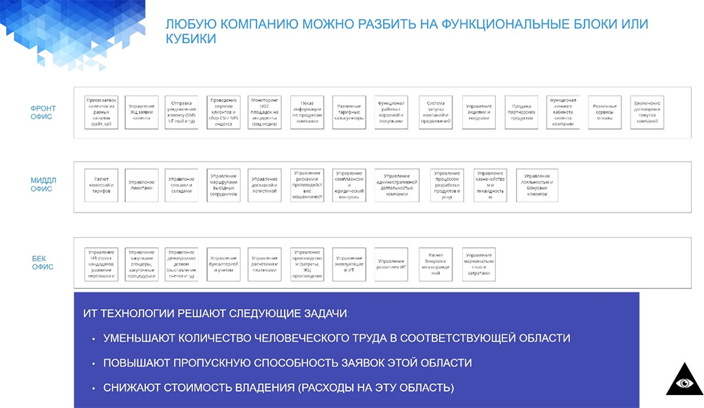 В каждой такой функции, есть тот кто ее выполняет, есть всегда результат этой функции. Для простоты давайте эти функции назовем “кубиками”. Фактически любую компанию можно разбить вот на такие кубики.