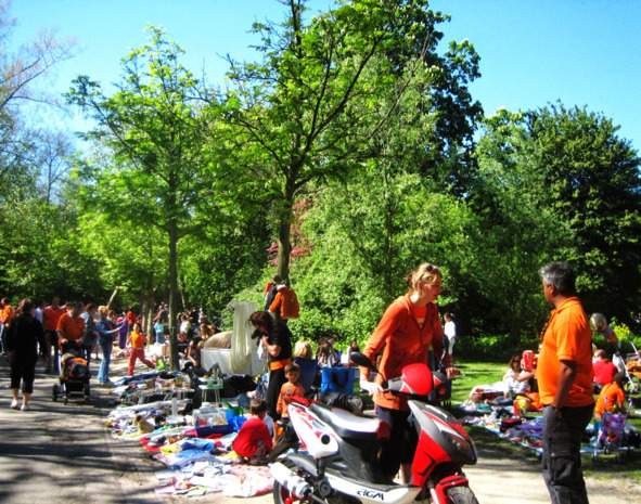 В День Королевы здесь проходят гулянья: традиционно открыт блошиный рынок, весь парк заполняют люди, продающие старые вещи, все можно приобрести за копейки, а иногда и получить вовсе бесплатно, сама я не любитель «секонд хендов», однако не смогла удержаться и купила за десять центов издание романа Диккенса «Дэвид Копперфильд» с великолепными иллюстрациями. В этот день большинство жителей Амстердама одеваются во все оранжевое в облике практически всех горожан присутствуют аксессуары оранжевого цвета. Все вокруг окрашено в апельсиновые цвета: футболки, куртки, кепки, шарфы. Вот уже несколько веков, начиная с 1550 года, этот цвет является символом династии Оранских-Нассау. Вечером, когда рынок сворачивается, начинается вторая часть праздника – концерты, которые устраиваются, разумеется, не только в парке, но и в центре города. Выступают на них обычно местные знаменитости, народ к этому времени уже слегка навеселе, все устремляются к сценам. К чести голландцев надо отметить, что, не смотря на их пристрастие к пиву и легким наркотикам, ведут они себя вполне достойно, и потасовок на таких мероприятиях, лично мне, видеть не доводилось. Перед тем как снова вернуться к рассказу о Vondelpark еще два слова об этом дне, точнее даже о ночи ему предшествующей, называется она соответственно Ночь Королевы, центр города превращается в огромную танцплощадку, вот уж где настоящее веселье. Все очень доброжелательны и запросто можно оказаться в очень необычной обстановке, непредставимой в другие дни, например, меня как-то занесло в гей-клуб где я уж точно не ожидала оказаться. К сожалению, мне не всегда удается побывать в Амстердаме в этот день, являющийся для голландцев праздником не менее важным, чем Рождество.