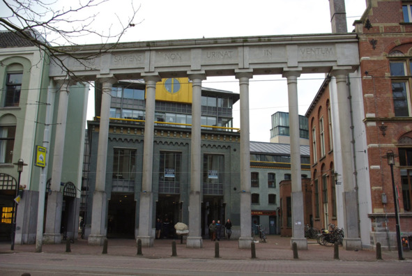 Поскольку я оказалась в этом районе, то правильно будет рассказать о нем, он очень живописный. В пяти минутах ходьбы от парка находится Leidseplein, площадь, пользующаяся особой популярностью у любителей ночной жизни: бары, кафе, дискотеки и кинотеатр, все они открыты допоздна. Между парком и площадью есть ворота, надпись на которых гласит «Homo sapiens non urinat in ventum», дословно это можно перевести так: «Человек не писает против ветра».