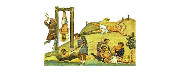Итак, доблестные святые устояли в подвиге с великой радостью, претерпев все истязания за имя Единородного Сына Божия и Спасителя мира. И точно, не доблестны ли были эти блаженные, когда своими очами увидели приготовленные для них страшные орудия мучений, горящий костер, печь и котлы, из которых каплями извергалась смола и жир; увидели также колеса, с принуждением и скрипом вертевшиеся в горящем огне, и еще – раскаленные в огне когти, пилы, тиски, буравы, оковы и узы; одним словом, орудия, какие враг всякой истины изобрел на исповедающих имя Спасителево. Все это разложил он перед мучениками, чтобы привести святых в страх и робость, и чтобы при виде этого удержали они язык свой от исповедания Христа Иисуса.