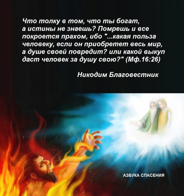 Некоторый человек был богат, одевался в порфиру и виссон и каждый день пиршествовал блистательно. Был также некоторый нищий, именем Лазарь, который лежал у ворот его в струпьях и желал напитаться крошками, падающими со стола богача, и псы, приходя, лизали струпья его. Умер нищий и отнесен был Ангелами на лоно Авраамово. Умер и богач, и похоронили его. И в аде, будучи в муках, он поднял глаза свои, увидел вдали Авраама и Лазаря на лоне его и, возопив, сказал: отче Аврааме! умилосердись надо мною и пошли Лазаря, чтобы омочил конец перста своего в воде и прохладил язык мой, ибо я мучаюсь в пламени сем. Но Авраам сказал: чадо! вспомни, что ты получил уже доброе твое в жизни твоей, а Лазарь – злое; ныне же он здесь утешается, а ты страдаешь; и сверх всего того между нами и вами утверждена великая пропасть, так что хотящие перейти отсюда к вам не могут, также и оттуда к нам не переходят (Лк.16:19—26).