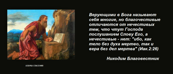 Что́ пользы, братия мои, если кто говорит, что он имеет веру, а дел не имеет? может ли эта вера спасти его? Если брат или сестра наги и не имеют дневного пропитания, а кто-нибудь из вас скажет им: «идите с миром, грейтесь и питайтесь», но не даст им потребного для тела: что пользы? Так и вера, если не имеет дел, мертва сама по себе. Но скажет кто-нибудь: «ты имеешь веру, а я имею дела»: покажи мне веру твою без дел твоих, а я покажу тебе веру мою из дел моих. Ты веруешь, что Бог един: хорошо делаешь; и бесы веруют, и трепещут. Но хочешь ли знать, неосновательный человек, что вера без дел мертва? Не делами ли оправдался Авраам, отец наш, возложив на жертвенник Исаака, сына своего? Видишь ли, что вера содействовала делам его, и делами вера достигла совершенства? И исполнилось слово Писания: «веровал Авраам Богу, и это вменилось ему в праведность, и он наречен другом Божиим». Видите ли, что человек оправдывается делами, а не верою только? Подобно и Раав блудница не делами ли оправдалась, приняв соглядатаев и отпустив их другим путем? Ибо, как тело без духа мертво, так и вера без дел мертва (Иак.2:14—26).