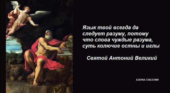 Муж мудрый хорошо знает, как себя держать, потому не спешит говорить, но взвешивает, где надо говорить и где слушать, напротив, муж ненаказанный не хранит этого, в тайне держимого, управления и обуздания языка. Не говори с раздражением, но да будут слова твои с мудростью и разумом, равно как и молчание твое. Подражай премудрым отцам нашим, которых слова всегда были полны мудрости и разума, равно как и молчание их. Когда сойдешься вместе с подобными тебе верными, избирай лучше слушать и уразумевать, что говорено будет другими, с готовностью исполнять спасительное. Это будет гораздо лучше, чем говорить самому. Когда сидишь среди братий, не слишком много говори, и если будешь о чем спрашивать их, скажи то кратко со смирением. Слова твои да будут со сладостью и в назидание. Помни, что от слов и слава и унижение. Те же, которые говорят все, что ни приходит им в голову, походят на двор без ворот, на который всходит кто ни захочет, подходит к стойлу и отвязывает осла. Мысль эта хоть не св. Антонием высказана, но в присутствии его, и им, конечно, одобрена.