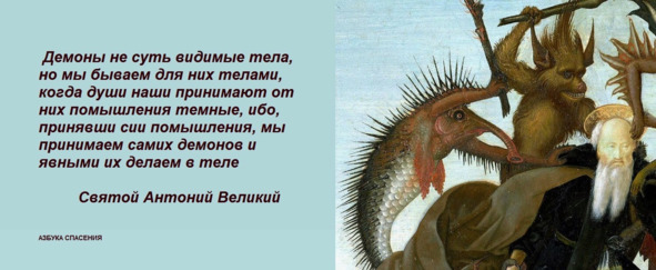 Демоны коль скоро увидят всякого христианина, а тем паче монаха, пребывающими в труде и преуспевающими, то первее всего покушаются и пытаются положить на пути соблазны: соблазны же их суть злые помыслы. Но нам не должно бояться этих внушений их, потому что молитвами, постами и верою в Господа враги тотчас низлагаются. Впрочем, и будучи низложены, они не успокоиваются, но тотчас опять приступают с коварством и хитростью. Когда не возмогут обольстить сердце явно нечистыми пожеланиями, то иным опять образом нападают, именно: устроивают разные привидения, чтоб устрашить, для чего претворяются в разные виды и принимают на себя образы: жен, зверей, пресмыкающихся, великанов и множества воинов. Но и таких привидений не должно бояться, потому что они ничто, и тотчас исчезают, коль скоро кто оградит себя верою и знамением креста.