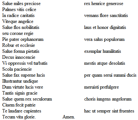 Oracio. Salus et saluator omnium in te credencium, piissime domine Ihesu Christe, qui dilectum famulum tuum regem henricum sextum variis tribulacionum pressuris opprimi voluisti, ut ex eius pacientissime et innocentissime vite meritis quasi quibusdam botris uberrimis copiosa tue gracie dulcedo per miraculorum gloriam distillaret in plebem: largire, quesumus, eos omnes qui tante eius glorie congratulantes aut illum propter te aut in illo te pocius glorificando dignis gestiunt collaudare preconiis ipsius beatitudinis consorcium et hic habere per meritum et in futuro consequi per effectum: qui cum deo patre et spiritu sancto viuis et gloriaris deus per omnia secula seculorum. Amen.