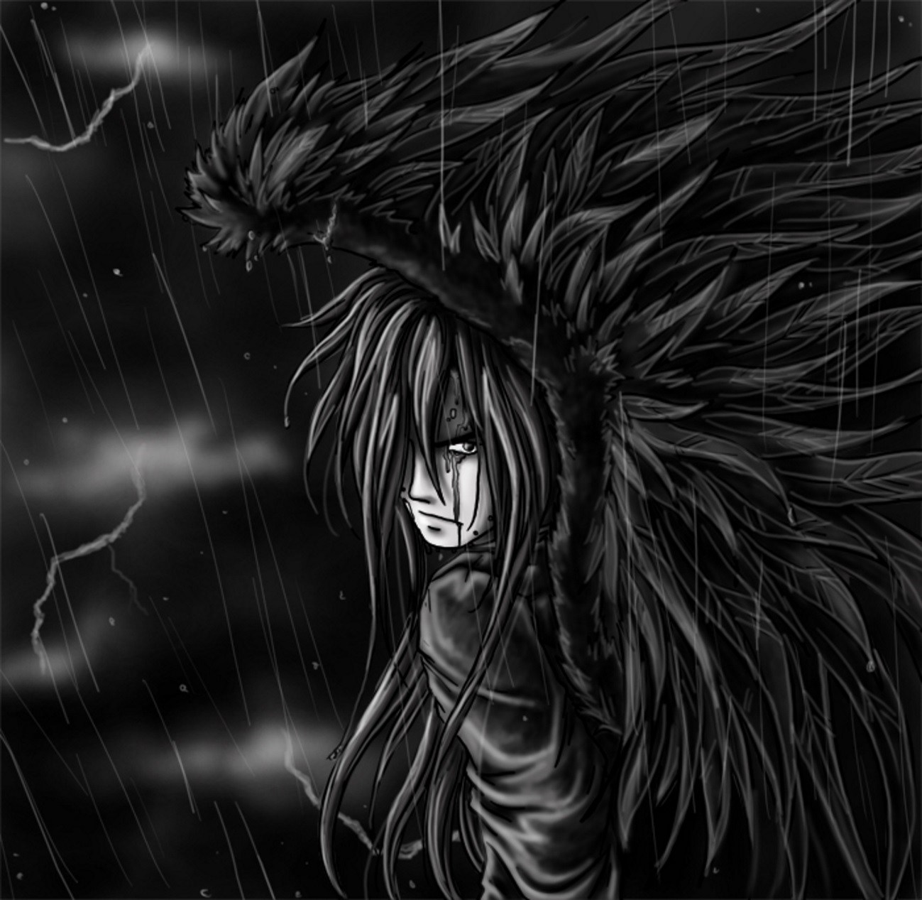Las plumas oscuras dejaron un camino en el cielo nocturno mientras Hyakuhei volaba dentro de la tormenta furiosa que habÃa creado ... su ira formaba el núcleo de la misma. Rayos y truenos imitaban su estado de ánimo mientras la lluvia ocultaba la verdad de su tormento. Su último poder era prosperar en la autoridad de los demonios que luchó y luego tomó dentro de su ser ... pero no habÃa esperado que se volviera contra el fuego de esta manera.
