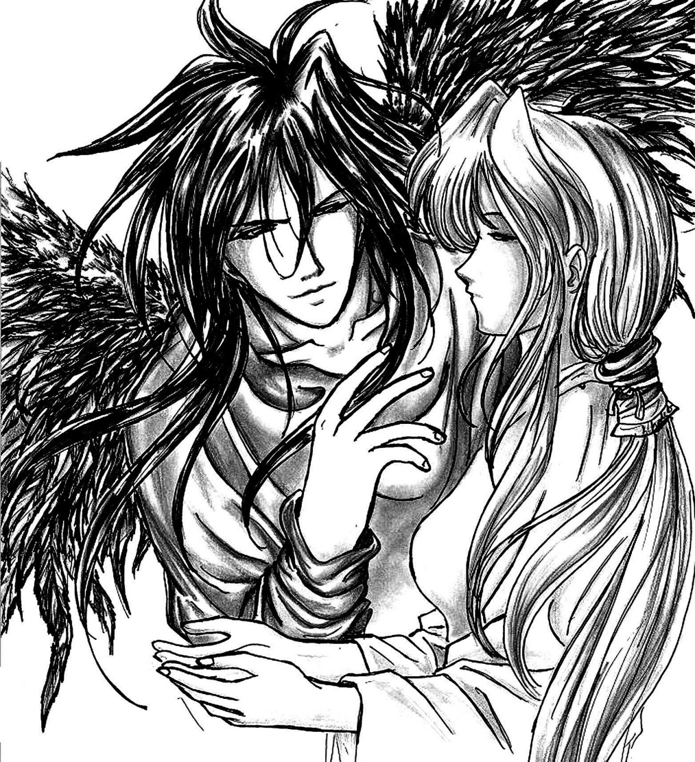 Hyakuhei stand da und starrte auf das Herz der Zeit, wissend, dass die Priesterin noch auf der anderen Seite war, in ihrer Welt. Sein nachtschwarzes Haar floss wie ein dunkler Schleier an seinem Körper hinunter, als seine Flügel sich weit öffneten, wodurch ein Luftzug über dem weichen Gras entstand. Seine perfekten Lippen wölbten sich leicht zu einem wissenden Lächeln. Ein dunkler Glanz entstand am Boden rund um den Schrein, wodurch dieser ein gespenstisches Aussehen erhielt.