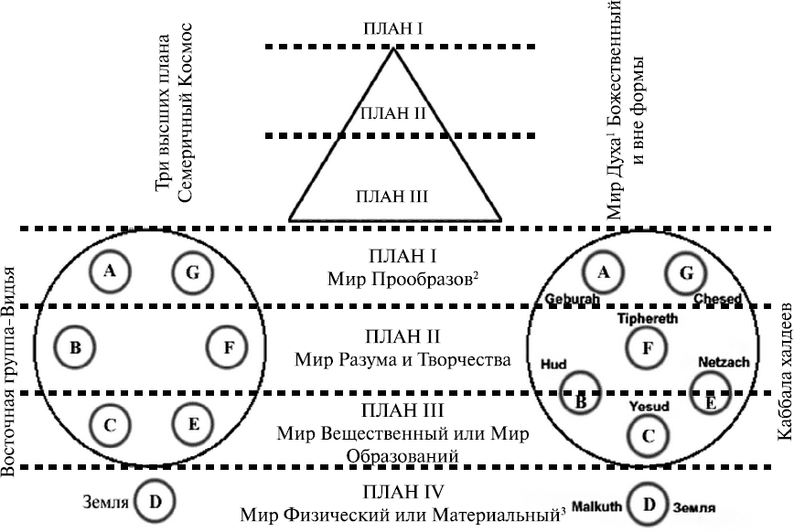 Следующая сравнительная диаграмма показывает тождественность двух систем, каббалистической и Восточной. Три верхние плана есть три высшие плана сознания, выдаваемые и объясняемые в обеих названных школах только Посвященным. Низшие изображают четыре низших плана – самый низший является нашим планом или видимой Вселенной.