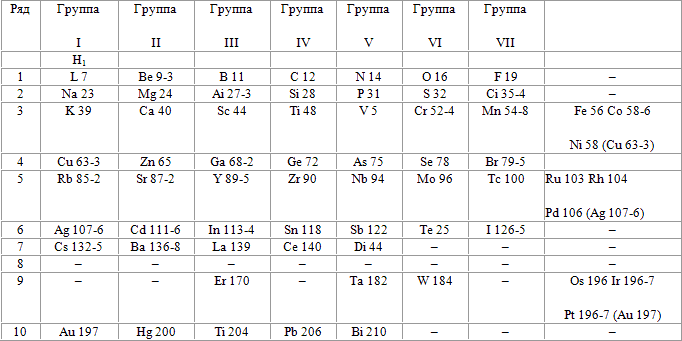 Таким образом, если химические элементы распределены по группам соответственно их атомическому весу, то будет найдено, что они составляют серию рядов по семи; при чем первый, второй и остальные члены каждого ряда обнаруживают тесную аналогию во всех своих свойствах с соответствующими членами следующего ряда. Приведенная таблица взята из «Магии Чисел» Гелленбаха и, будучи исправлена, обнаруживает этот закон и вполне доказывает заключение, выводимое им, в следующих словах: