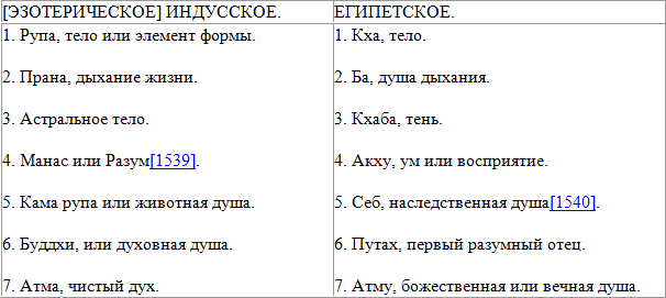 И еще большее значение, ибо эти звезды изображают также семь ключей семи церквей или же, каббалистически, означают содалийские Мистерии. Впрочем, мы не будем задерживаться в обсуждении, но добавим, что другие египтологи также открыли, что семеричное строение человека было основной доктриной среди древних египтян. Франц Ламберт из Мюнхена, в ряде замечательных статей в «Сфинксе», приводит неопровержимые доказательства своим заключениям из Книги Мертвых и других египетских рекордов. Для подробностей читатель должен обратиться к самим статьям, но следующая диаграмма, суммирующая заключения автора, является наглядным доказательством тождественности египетской Психологии с семеричным делением в «Эзотерическом Буддизме».