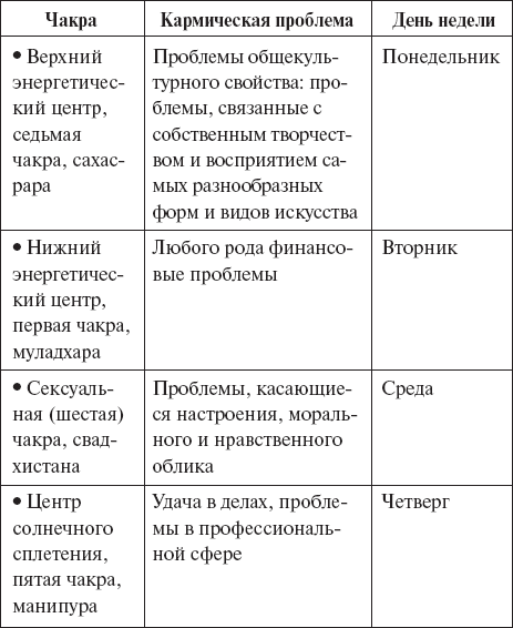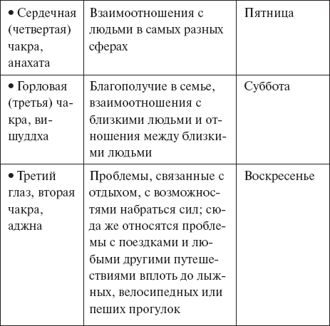 Чакр, как вы уже знаете, в общей сложности семь – ровно столько, сколько дней в неделе. Каждой чакре соответствует свой день недели. В таблице обозначены эти соответствия и отмечены проекции каждой из семи чакр на конкретные группы личных проблем, характерных для многих моих пациенток.