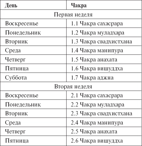 Для вашего удобства привожу таблицу-график распределения чакр по 28 дням. Обращаю ваше внимание на то, что произнесение вечером происходит по чакре следующего дня.