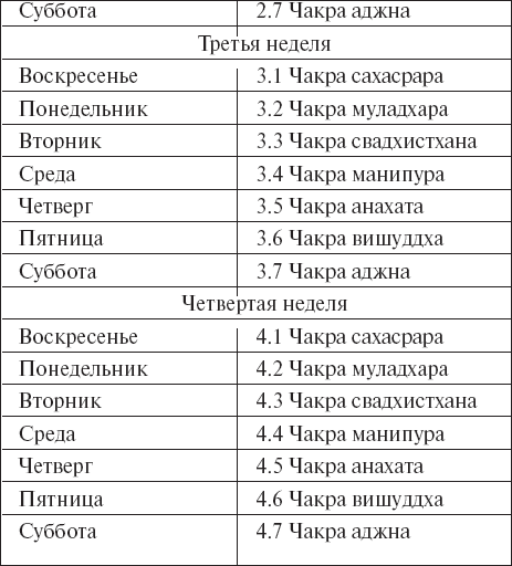 Первое воскресеньеРаботаем в направлении: верхний энергетический центр, седьмая чакра, сахасрара (то есть работать всегда будем, как и указано в таблице, с чакрой следующего дня).