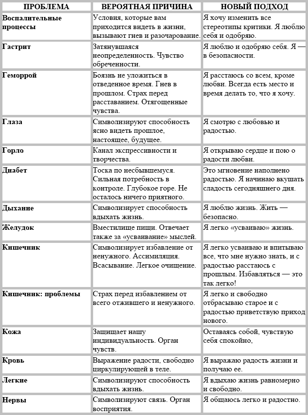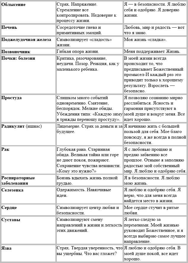 Я приведу здесь часть таблицы, разработанной американской исследовательницей. В этой части вы найдете наиболее распространенные недуги и указания на те органы человека, которые в большей степени подвержены хворям и отклонениям. Во втором столбце вы обнаружите наименование функциональной духовной причины, приводящей к тому или иному недугу или к аномалии в том или ином органе. Третий же столбец подскажет вам духовный выход из сложившейся ситуации.`