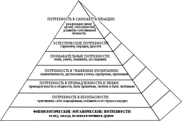 Один американский психолог на основе собственных многочисленных опытов составил большую схему, своего рода классификацию потребностей человека. Эта классификация получила широкое распространение в виде пирамиды. Вот она – пирамида потребностей: