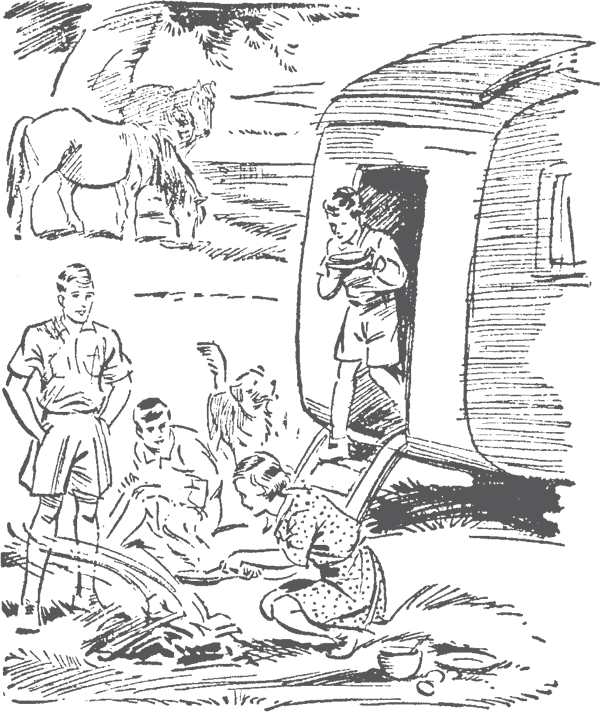 Джулиан сказал, что в фургоне жарко готовить, и развёл костёр на воздухе. Дик распряг лошадей, и те побрели к воде.