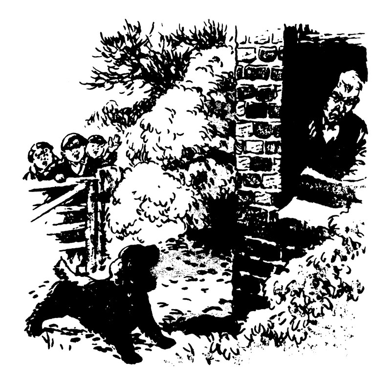 Скампер остановился и яростно залаял на сторожа. Тот скрылся. Но тут отворилась боковая дверь, и старик появился с большой палкой в руке. Он яростно потряс ею перед испуганными детьми.