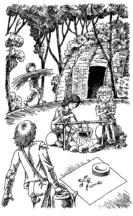Прежде всего дети перетащили в дупло сухого дерева всю одежду, из которой ещё не успели вырасти. Оставили только то, что на себе. Майк прихватил на кухне четыре эмалированные кружки, четыре такие же миски и четыре тарелки. Нора стащила старый закопчённый чайник, который тётя Гарриет запрятала подальше с тех пор, как купила новый. Старого чайника она и не хватилась. Пегги повезло меньше. Тётка заметила пропажу сковородки и кастрюли и наказала девочку, но так и не догадалась, что́ на самом деле происходит.