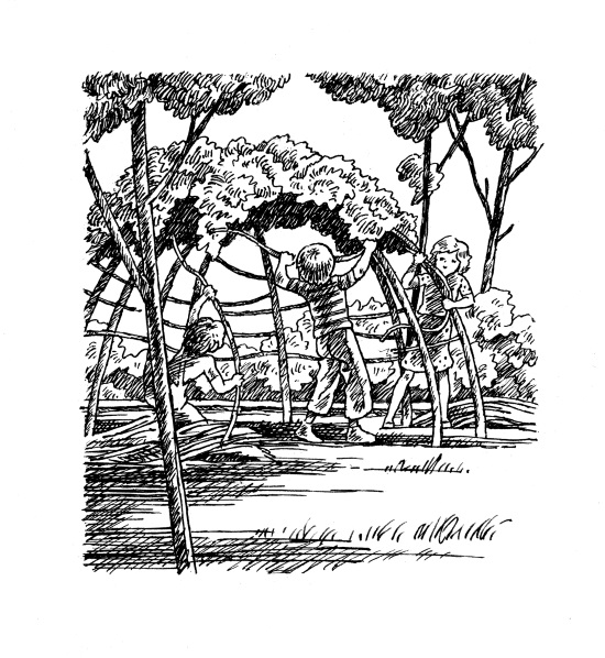 Всё утро четверо детей усердно строили дом. Джек срубил несколько молодых ив, чтобы сделать из них сваи – несущие опоры. Майк выкопал ямы, а потом оба мальчика укрепили в земле сваи. Девочки запрыгали от радости, увидев, какую прекрасную основу для стен делали мальчишки.