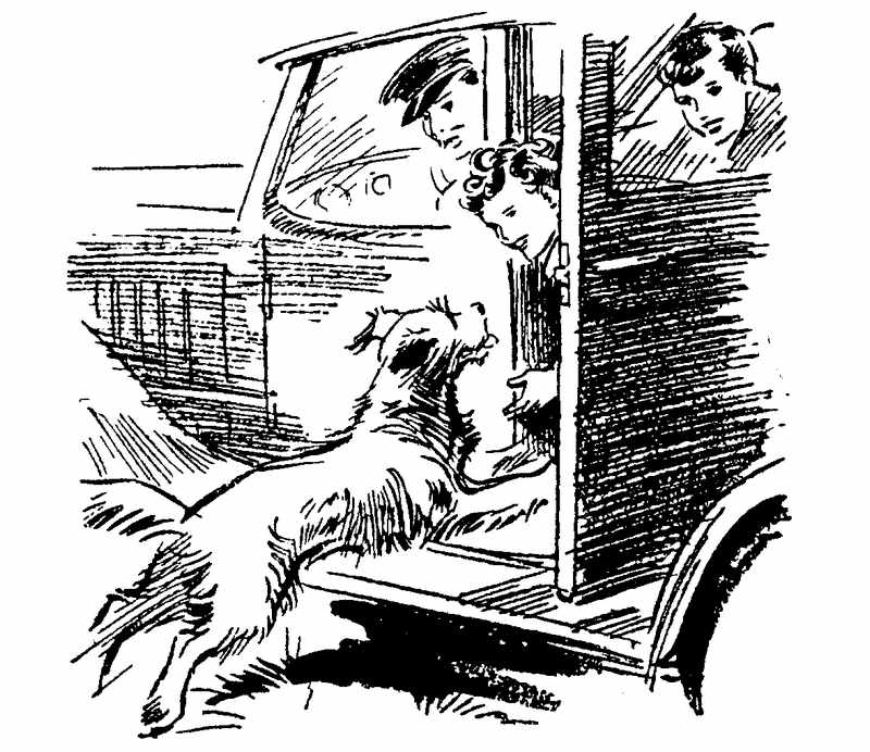 Джулиан, Дик и Энн посмотрели на Джордж с удивлением. Водитель тоже удивился, но послушно остановил машину. Джордж открыла дверцу и пронзительно свистнула. В ту же секунду из-за ближайшей изгороди вылетел мохнатый шар и, бросившись к машине, пулей влетел внутрь.
