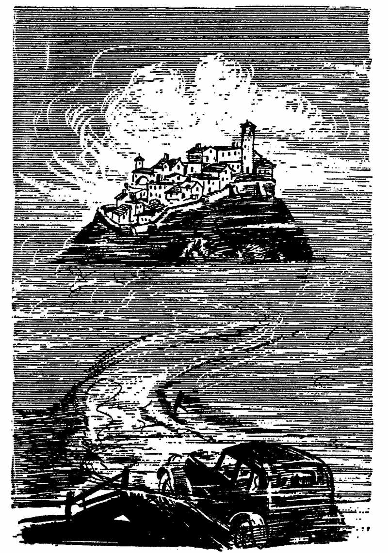Ребята напряжённо всматривались в даль, где начинали проступать очертания какой-то горы. Склоны её были обрывисты и круты. Гора медленно выплывала из сырой дымки и, казалось, будто парила над землёй. Это и был тот холм, на котором стоял город Кастауэй. Подножие холма по-прежнему плотно окутывал туман, зато вершина его становилась видна всё лучше и лучше. На ней грудились какие-то дома, много домов, крыша к крыше. У некоторых имелись башни. Те были тоже старые, а вернее, старинные, как и сами здания.