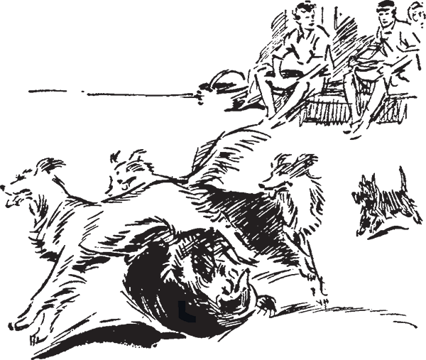 Тим благодарно лизнул Джордж в шею и сбежал с крыльца. Сначала он повозился с терьером, потом стал бегать вокруг колли и вдруг бросился наутёк, описывая по двору большую дугу. Колли кинулась за ним. Это были большие крупные собаки, и они легко догнали Тима, сбив с ног. Тим покатился по земле, но тут же вскочил и стал нападать на колли.