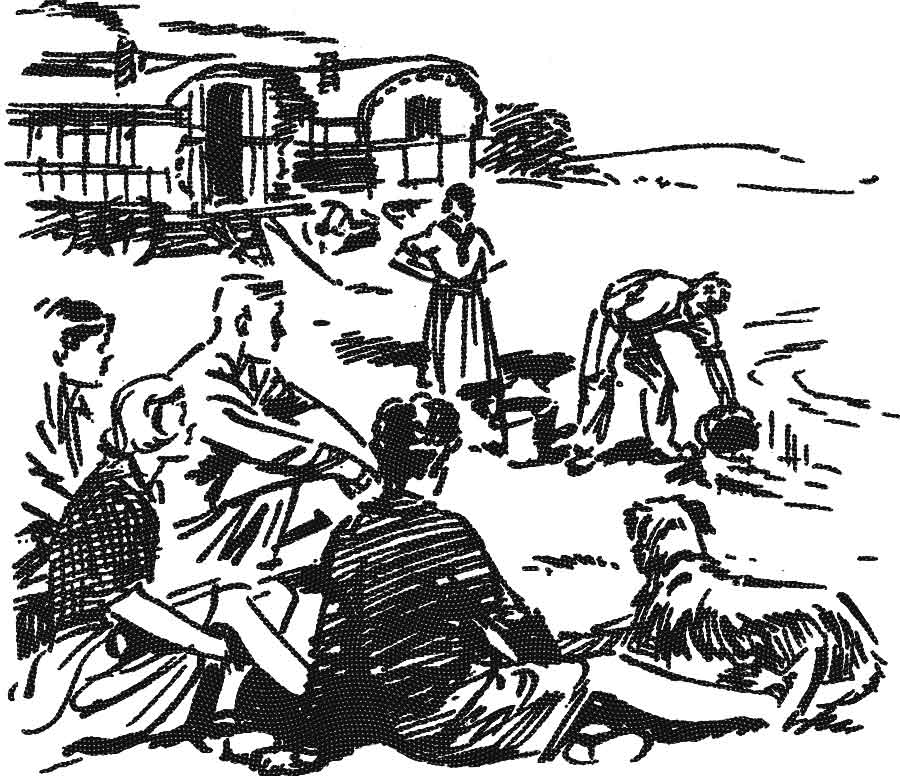 Было очень интересно наблюдать за артистами. Они болтали, смеялись, заходили друг к другу в гости и весело перекрикивались. Наконец три женщины с корзинками направились в сторону деревни.