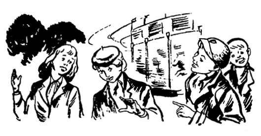 В пять часов на автобусной остановке на Хай-стрит собралась целая толпа детей на велосипедах. Первыми приехали Питер и Джанет. Питер считал, что раз он главный, то должен всегда приходить вовремя. Сразу после них прикатил Колин. Он очень торопился, чтобы не опоздать, и сильно запыхался. Потом появились Пэм и Барбара, а за ними – Джордж.