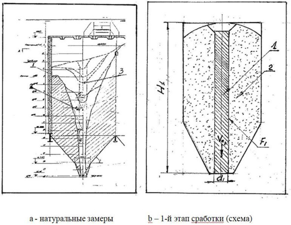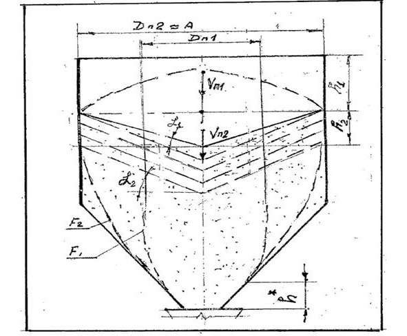 1-й этап (рис 1—6б). Поток имеет постоянную скорость V1, диаметр d1, форма потока (контур F1) – цилиндр, и протяженность Н1 на всю высоту бункера.