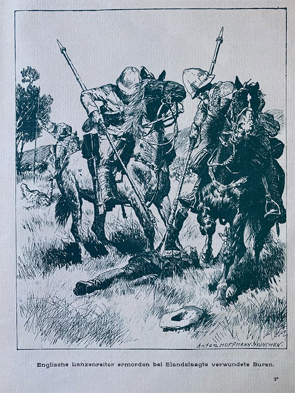 В этой бурской войне англичане также не понесли ответственности за боевые лавры, которых они были лишены, из-за их жестокости и трусости. И буры, и немцы неоднократно клялись, что при Эландслаагте, где немецкий корпус продвинулся чуть дальше и поэтому был разбит превосходящими английскими силами, причем англичане грабили и убивали раненых. Особенно отличился в этом отношении 5-й уланский полк англичан. У раненого учителя гимназии, г-на Бейлевельда из Претории, отобрали 14 фунтов стерлингов, у генерала Кока – 40 фунтов стерлингов. Тело доктора Костера было полностью разграблено. Когда уланы навалились огромным превосходством на 90 буров и немцев, будучи головным отрядом обороняющих город Кольсберг, защитники бросили винтовки и подняли руки вверх. Под присягой трансваальский Старший ведомственный руководитель Саузенталер, позже попавший в плен на корабле «Пенелопа», показал, что английский капитан уланов крикнул: «Kill the buggers!» («Убивать этих засранцев!»). И тут же беззащитные были заколоты штыками. Мало того! Лежащие на земле раненные, тоже были заколоты!
