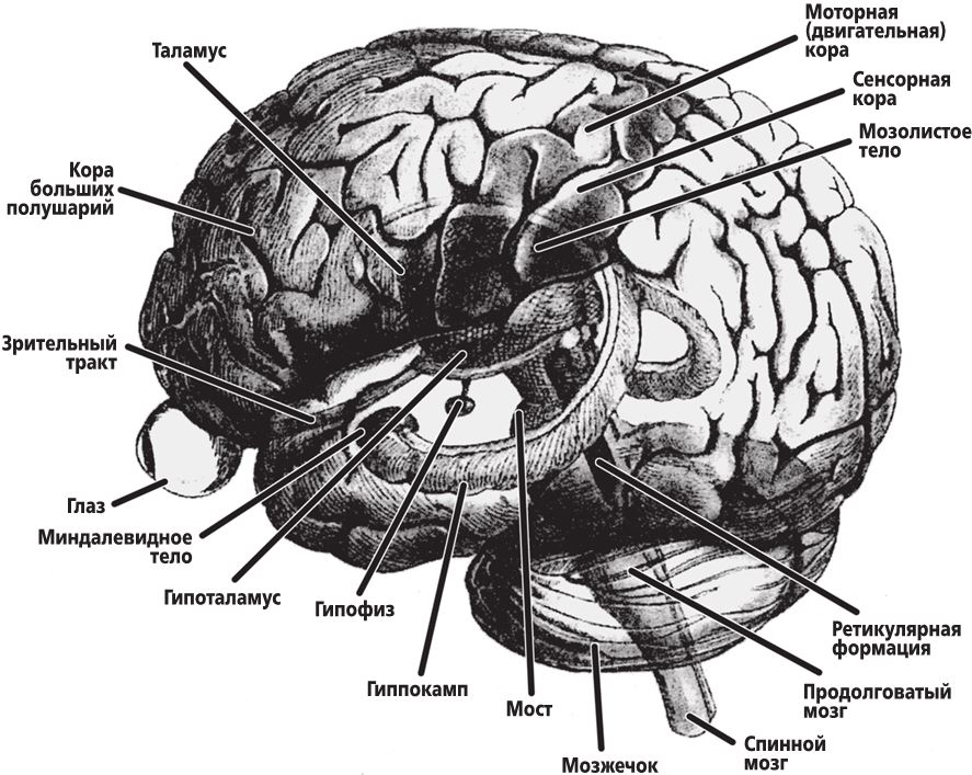 Изображение мозга с частично прозрачной корой, под которой видны внутренние структуры. Посередине находится таламус (выделен темным); между ним и корой расположены базальные ганглии (не показаны). В височной доле находится миндалевидное тело («ворота» в лимбическую систему) и гиппокамп (отвечающий за память). Помимо миндалевидного тела, на рисунке можно видеть и другие части лимбической системы, например гипоталамус (расположен ниже таламуса). Пути лимбической системы опосредуют эмоциональное возбуждение. Полушария соединены со спинным мозгом мозговым стволом (состоящим из продолговатого мозга, моста и среднего мозга). Под затылочными долями находится мозжечок, отвечающий главным образом за координацию и синхронизацию движений.[13]