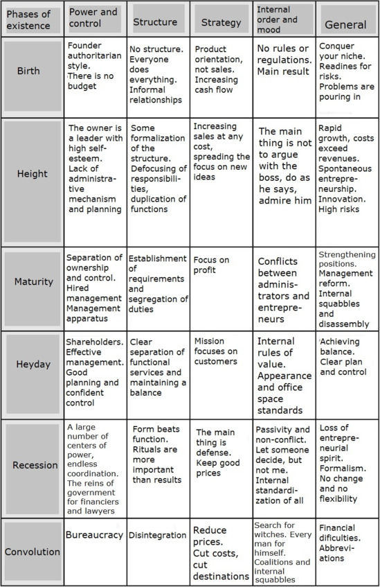Generalized change in the characteristics of the company by phases of the Adizes life cycle is shown in Table 3.