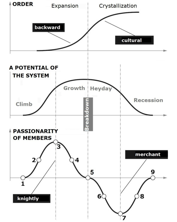 7) After they have eaten and drunk everything valuable that has been preserved from heroic times, the last stage begins – the Memorial Phase, when the system retains only the memory of its historical tradition. Then the memory also disappears, the time of balance with the environment comes, when people prefer philistine peace and measured existence to great plans. The despotism of Tradition, the authority of the Elders (age is the measure of everything, not talent or heroism), and an unchanging caste structure are established. Passionarity is only enough to maintain the economy established by the ancestors. Peace reigns until an external enemy destroys the system that has outlived itself, or a new community is born inside it, whose members will proclaim – «We are different! The old course of life must be broken,» and the old system no longer has the strength to destroy the new formation.