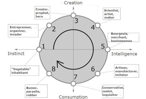 Passionarity, like a psychotype or character, can be a complex characteristic. The derivative of the potential can determine the projection of various personality traits that is most in demand by the current state of the system: let’s put aside upwards on the vertical axis – the desire for creative activity, downwards – towards consumerism, horizontally to the left – the predominance of instinctive reactions, to the right – mental activity. Then the points on the passionarity curve will be located on approximately the following trajectory – see Fig.11.
