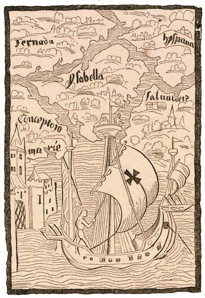 Корабль Колумба у Карибских островов. Гравюра из иллюстрированного издания писем Колумба, опубликованного в Базеле в 1493 г.