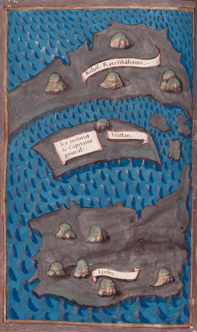 Карта Висайских островов (Филиппины) из «Отчета» Пигафетты. 1525 (в центре изображен остров Мактан и указано место гибели Магеллана)