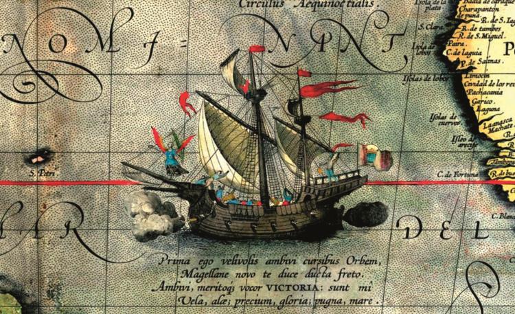 Каракка «Виктория» – корабль экспедиции Магеллана. Изображение на карте из атласа Абрахама Ортелия «Theatrum orbis terrarum» («Зрелище круга земного»). Издание 1590 г.
