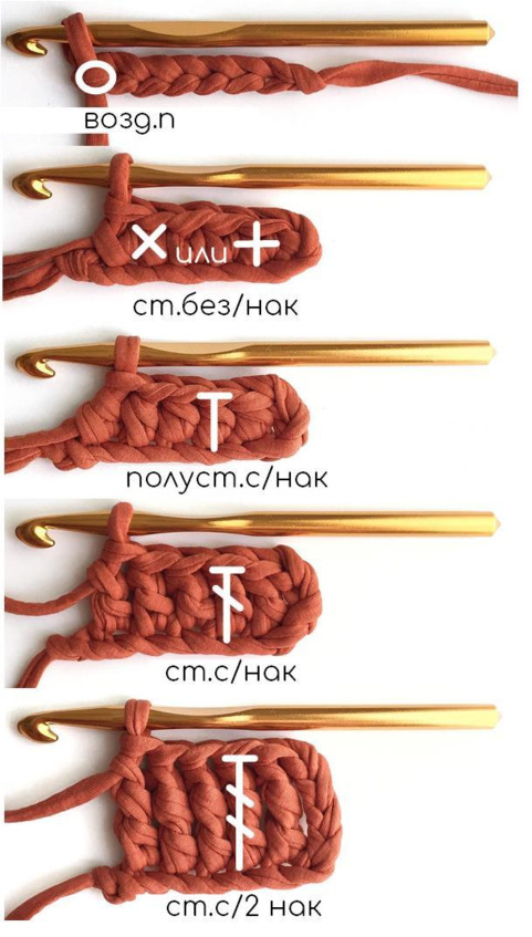Столбик без накида – вводим крючок в петлю основания, захватываем рабочую нить – протаскиваем, на крючке – 2 петли, опять захватываем рабочую нить и протаскиваем через две петли на крючке.