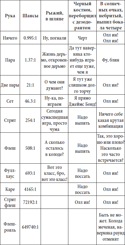 Я и в Вегасе выбирал игры, проходившие в отдельных дальних комнатах, почти без публики, и постепенно увеличивал свой стек[4] и количество игроков, с которыми мог сидеть за столом. Между играми я вытаскивал свой блокнот, не только чтобы напомнить себе, что́ мне на самом деле нравится пить, и заказать ровно это, но и чтобы занести в таблицу характеристики игроков. Они думали не только о картах, но их настроение и мысли, даже если напрямую не касались игры, выдавали их дальнейшие тайные намерения. На каждого была заведена отдельная колонка.