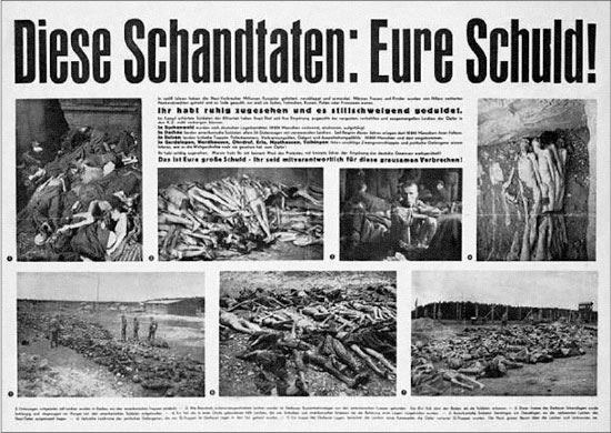 С самого начала понятия вины и ответственности, осуждения и позора стали фактически синонимами оккупации как таковой. Союзники «считали немцев нравственно нечистыми», что и демонстрировали, развешивая изображения убитых людей на деревьях и городских площадях в сопровождении текстов обвинительного характера, как на плакате внизу: «Это ваша вина»[83].