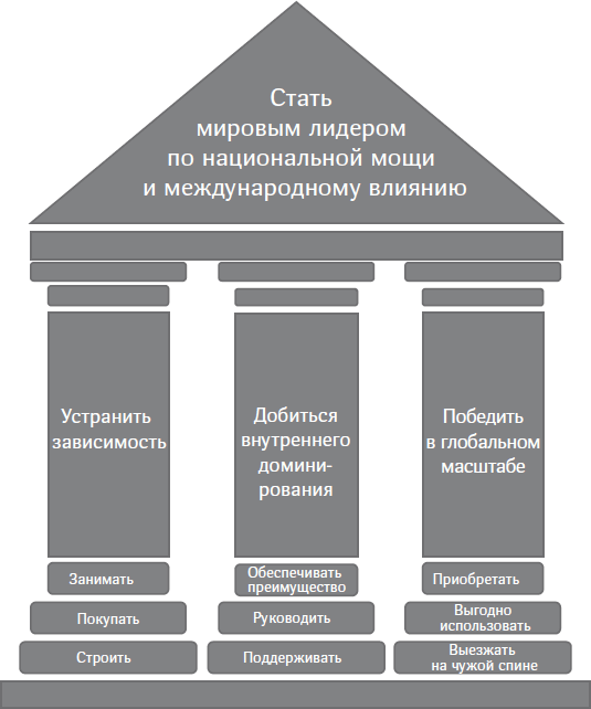 Стратегия. Но иметь амбициозную концепцию – это одно, а вот реализовать – совсем другое. Чтобы добиться цели, нужно иметь план – стратегию, как сражаться и побеждать по пути. Корпорация Китай именно это и делает. По сути, Си сформулировал стратегию из трех частей или то, что мы называем «стратегические направления», опоры, так сказать, столпы. Первое направление – ослабить и эффективно устранить избыточную зависимость Китая от иностранных фирм в области ключевых технологий и продуктов. Второе направление – это обеспечить доминирование местных фирм на внутреннем рынке Китая. Третье направление – победить в глобальном масштабе. Если коротко, то Корпорация Китай стремится стать мировым лидером по части национальной мощи и международного влияния, ослабив внешнюю зависимость, заняв преобладающие позиции внутри страны и одержав победу в глобальном масштабе. И для каждого стратегического направления имеются три ключевые тактики, предназначенные для достижения стратегических целей. Руководителю корпоративных коммуникаций любой западной многонациональной корпорации не потребуется и нескольких минут, чтобы взять эти элементы и создать на их основе симпатичную графику, которую можно затем поместить в презентацию PowerPoint и выдать для внутреннего и внешнего употребления. Выглядеть это будет примерно так, как на рис. 1.8.