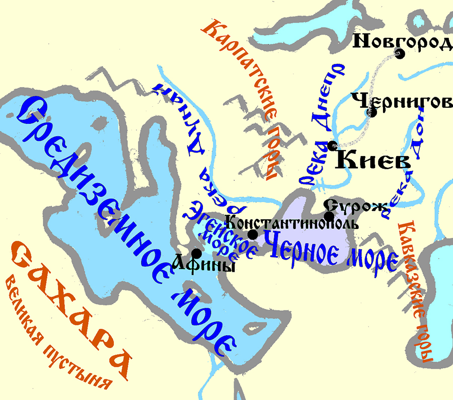 – Смотрите: в сторону Новгорода лежат дремучие леса. Правильно? А южнее – степи, – показывал Креонт. – Как писал Фукидид? "За дикими степями, за высокими горами, за морем, которое как небо…" Если лететь над степью, можно прилететь сюда – к Карпатским горам, – он постучал по неровным зубчикам на картинке. – А можно и сюда – к горам Кавказским. Но за Кавказскими горами никакого большого моря нет, а за Карпатскими – наоборот, простирается Средиземное море, которое древние ученые даже сравнивали с океаном, а ваши мореплаватели прозвали Великим. И между прочим, воды его славятся своей небесной голубизной. И вот, посмотрите!.. – престарелый грек поискал вокруг себя, нашел возле печки длинную соломину и приложил ее к карте. – Глядите, я веду линию от Киева, через Карпатские горы, дальше через море и – куда попадаю?
