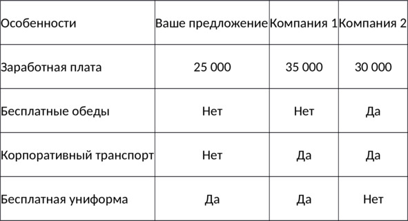 Чтобы наглядно визуализировать результаты анализа, рекомендуем составить таблицу для сравнения. При оценке EVP конкурентов может показаться, что предложения похожи – это повод подумать, что вы можете предложить нового для имеющихся и будущих сотрудников.