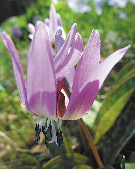 Торопится зацвести нечастый гость в наших садах кандык, он же – эритрониум сибирский. За кособокую форму луковицы его часто именую собачьим зубом. Это очень интересное растение. Пока кругом лежит снег, из земли лезут трубочки листьев, поначалу красно-коричневого цвета, – для «сугреву», как говорят в народе. Потом эти листья разворачиваются, становятся пятнистыми. Со временем пятна исчезают, лист бледнеет. Постепенно раскрываются шесть сиренево-розовых лепестков, внутри цветка – желтые или синие пыльники. Когда цветок опылится, лепестки отгибаются назад. Цветок становится похожим на цикламен.