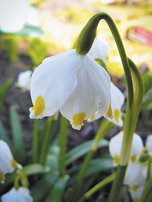 Немного позже зацветает белоцветник (леукоюм). Цветок его очень похож на галантус, но он крупнее, зацветает позже, а само растение выше. Все лепестки цветка одинакового размера, а кончики у них с зеленым или желтым пятном. Размножается луковичками, которые высаживают на глубину 8-11 см. При семенном размножении растения зацветают на шестой год.