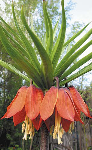 Растет этот пучок не по дням, а буквально по часам. Через 2–3 дня растение достигает 40–50 см, не успев привести в порядок слегка помятые листья. Еще через пару дней растение прихорашивается, листья у него разглаживаются – и вот уже гордо стоит стройная красотка с атласными листьями. Это фритиллярия императорская. Среди многоликой своей родни она выделяется царственным видом. Рядом с ней все остальные фритиллярии – просто рябчики.