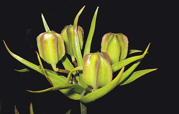 Плоды похожи на зеленые бочонки с сиреневыми ребрышками. Поначалу они свисают вниз, а затем ножки у них изгибаются и поднимают бочонки. Получается очень симпатично: пучок листьев окружен семью-восемью бочонками, словно толстенькие гномики уселись вокруг зеленого костра. Такая картина наблюдается только в теплую весну. Если весна запоздает, «гномики» не появятся.